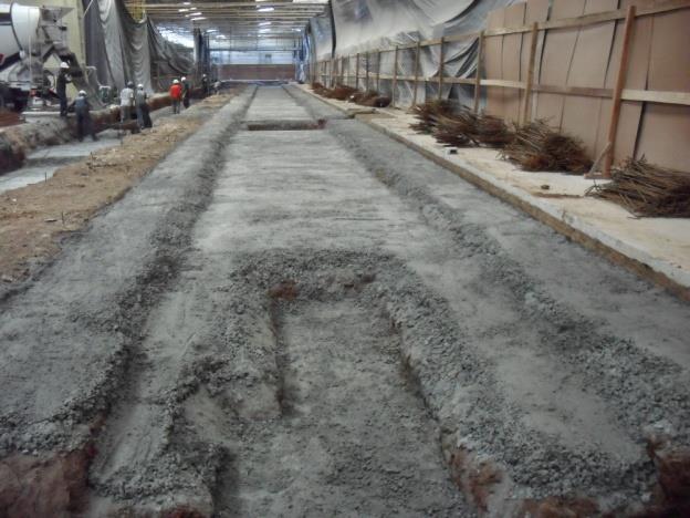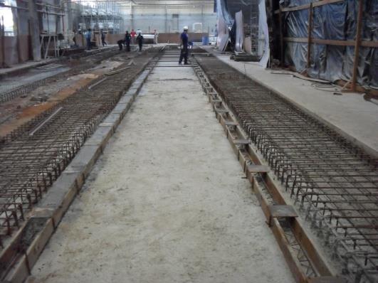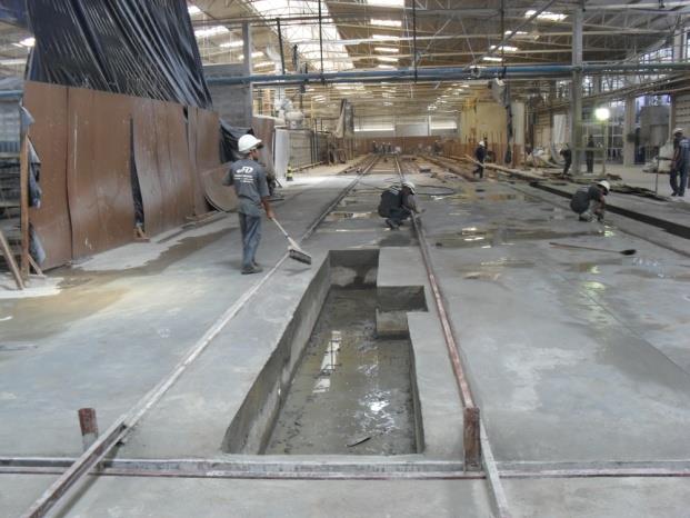 Construção de base e linhas de transferência para instalação de forno de requeima e forno túnel, com 110 metros de extensão, garantindo robustez estrutural e precisão técnica.